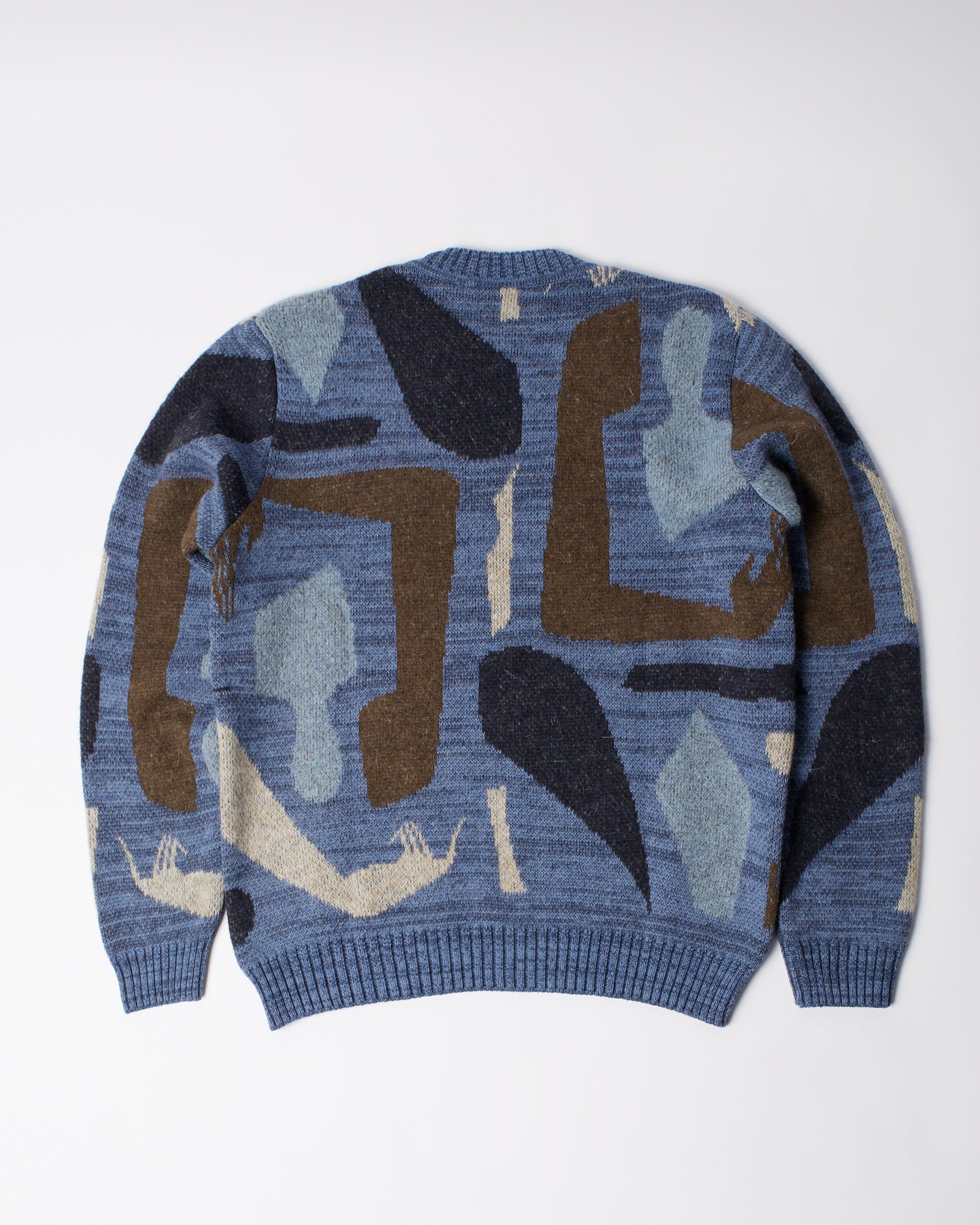 Knitted pullover with the "Detached" artwork all over, and small logo embroidery on the chest.