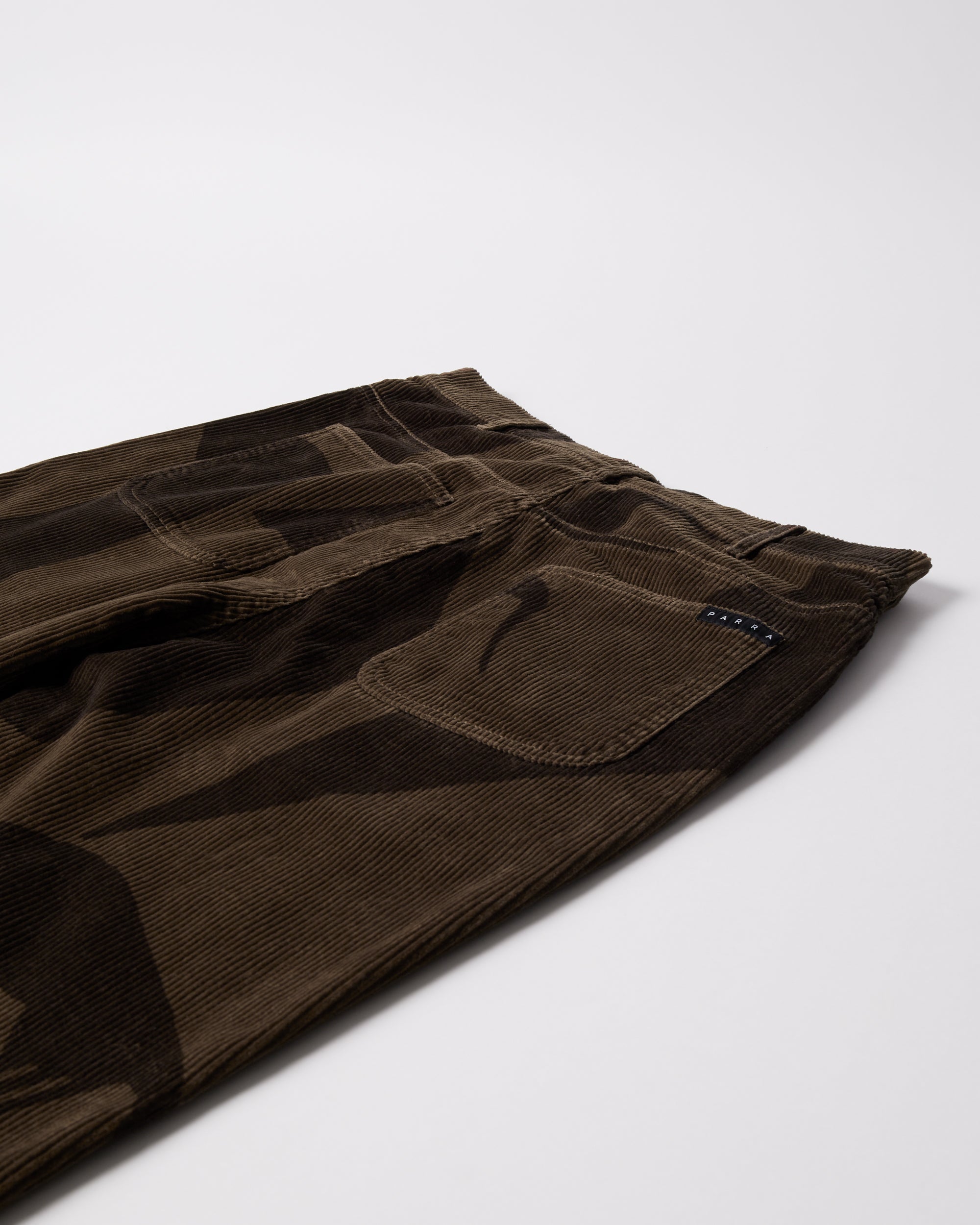Corduroy pants with randomly placed surface print from the "Detached" artwork.