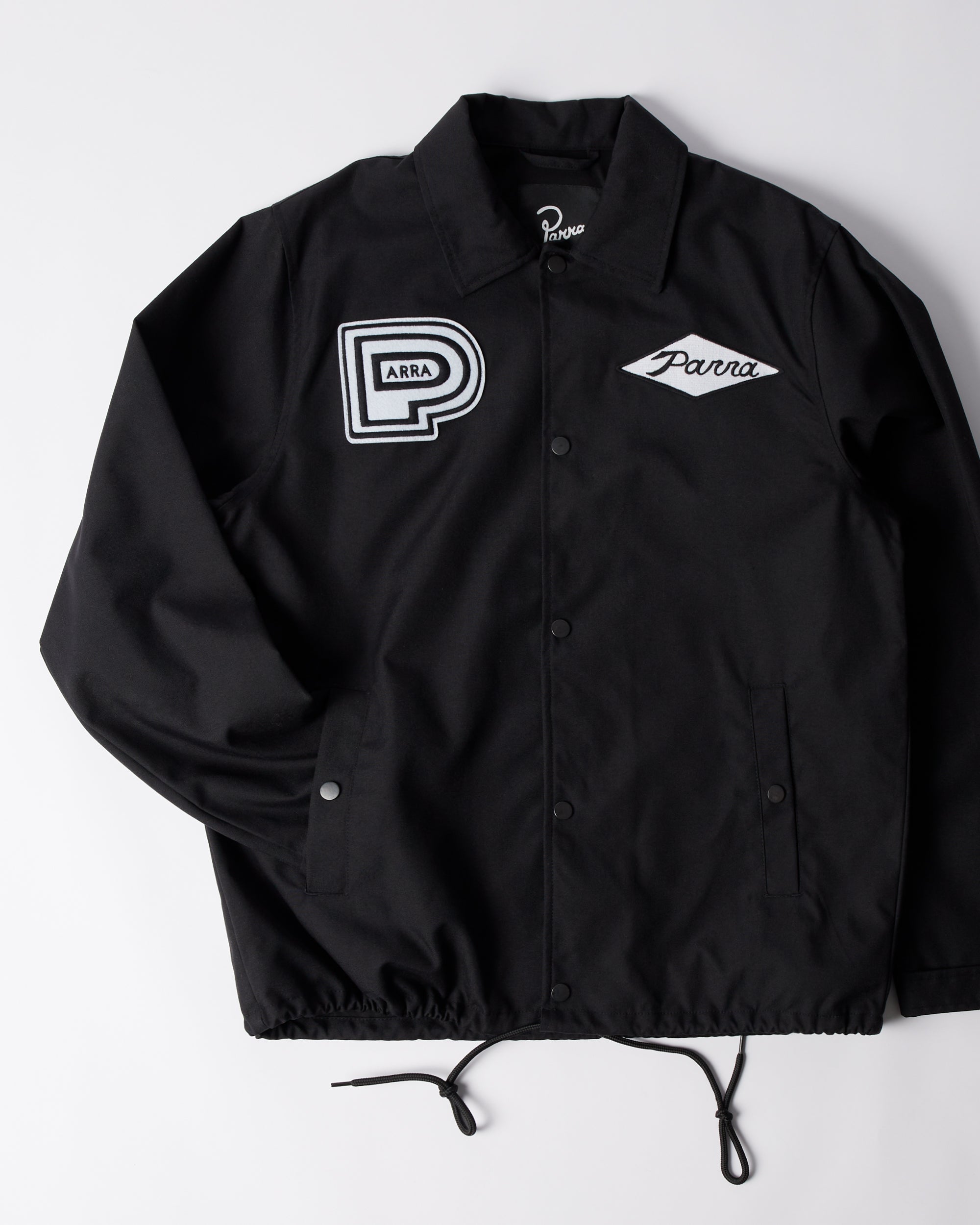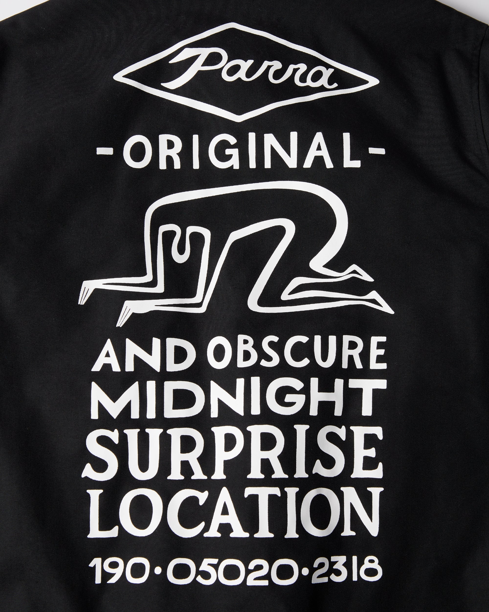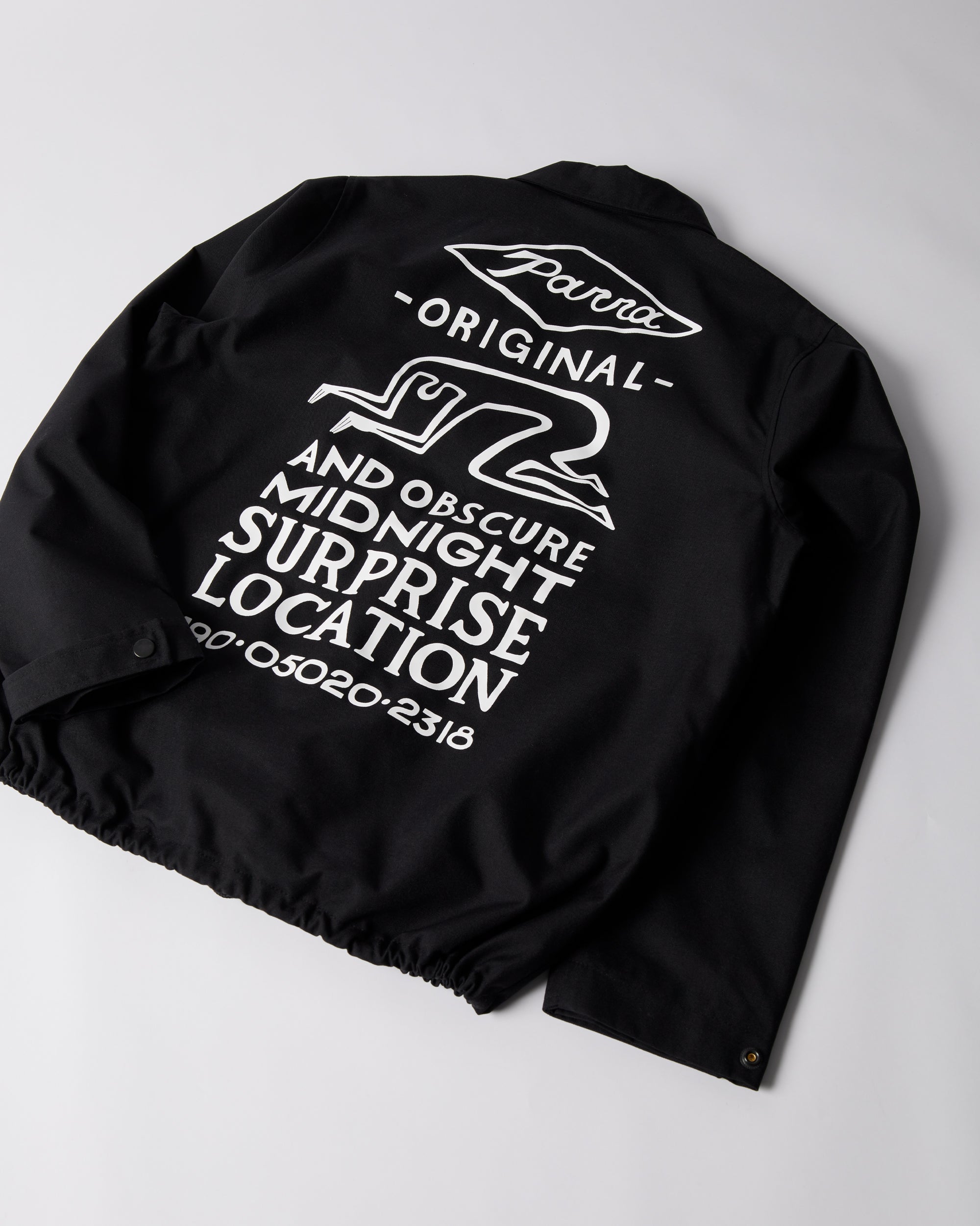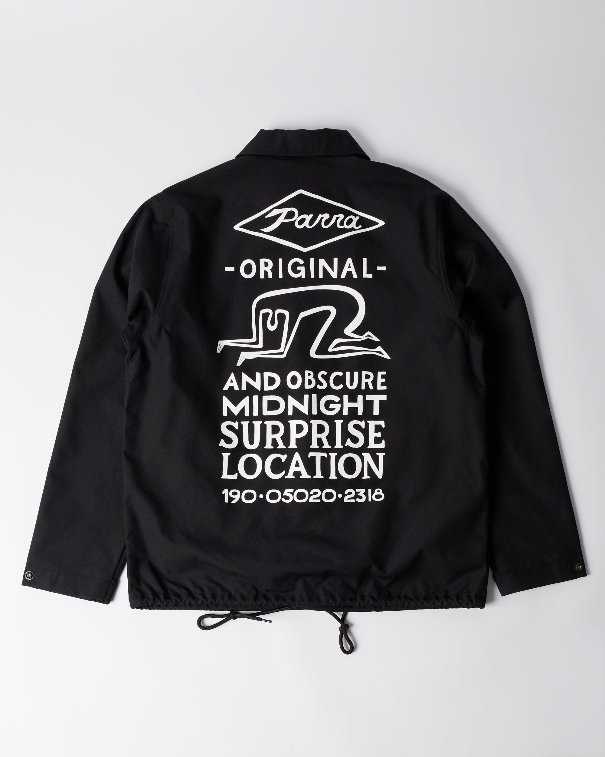 Classic coach jacket made from Nylon Oxford water repellent fabric. Big Midnight surprise print on the back and two Parra applications on the front.