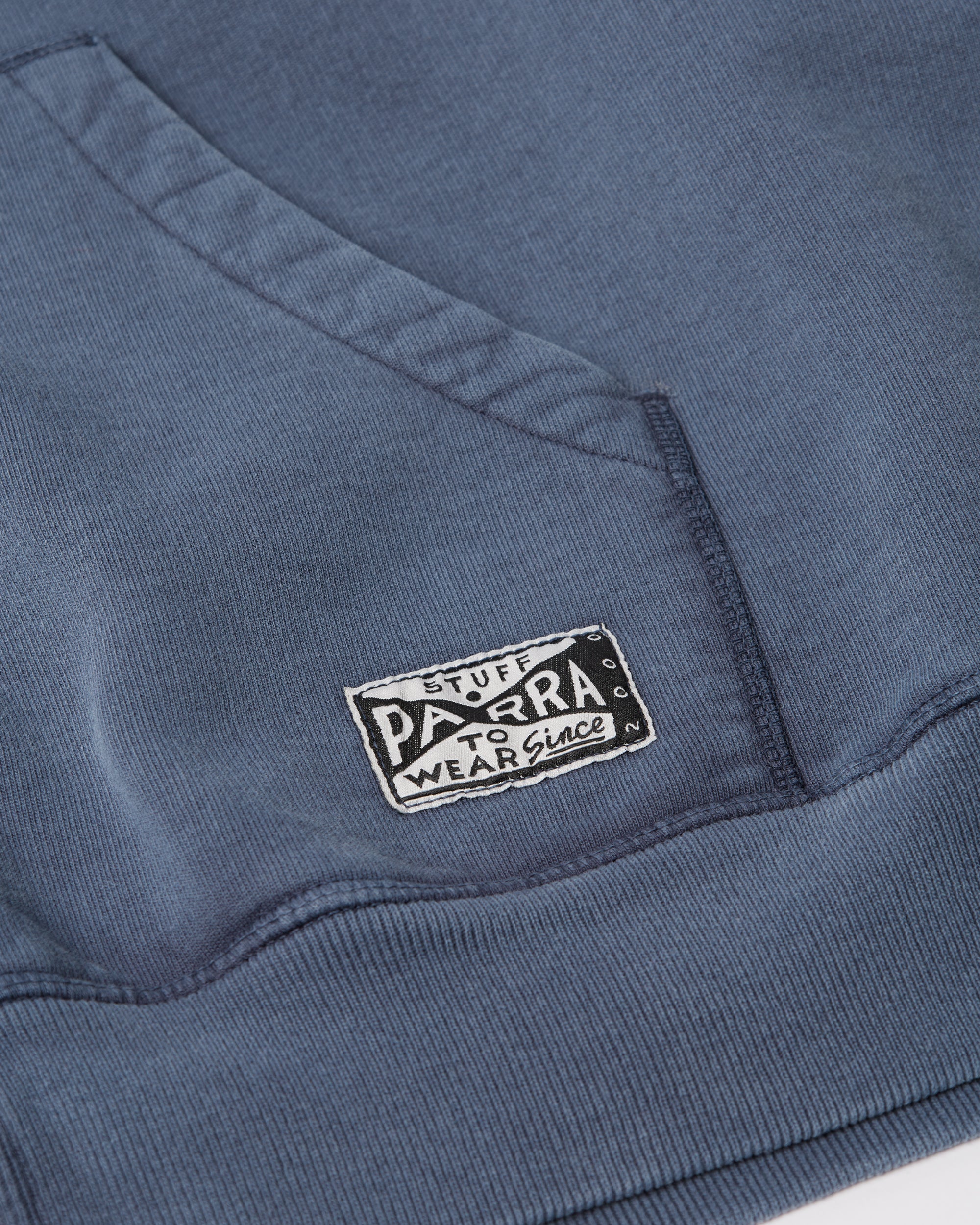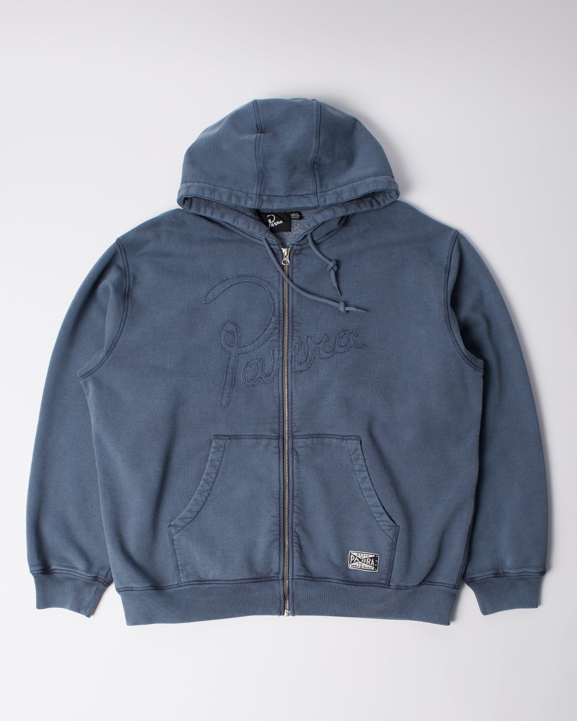Zipper hoodie with signature Parra logo as a self fabric application on the front. All by Parra sweaters have a custom boxy fit.