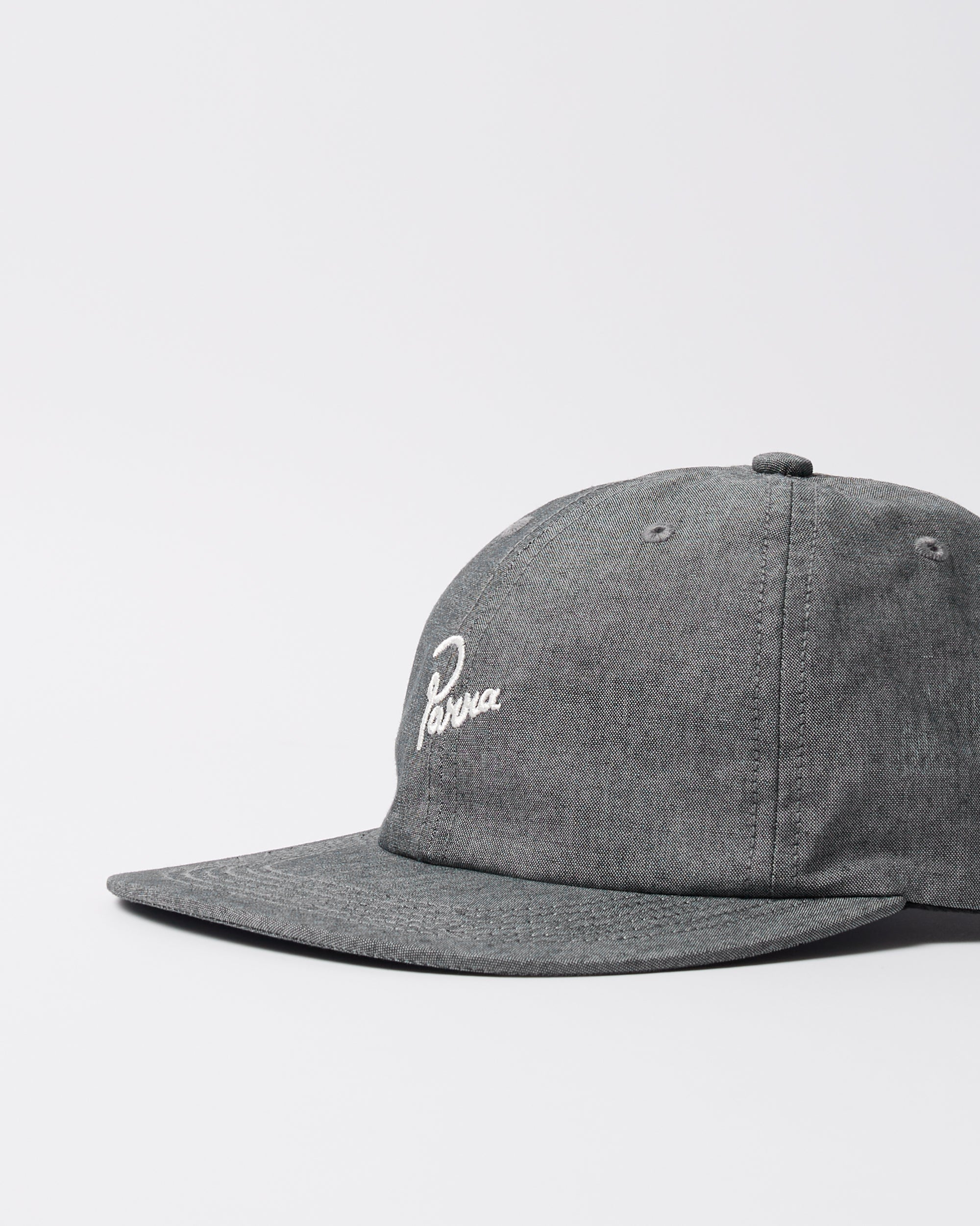 Unconstructed cotton chambray fabric hat with signature logo embroidery.