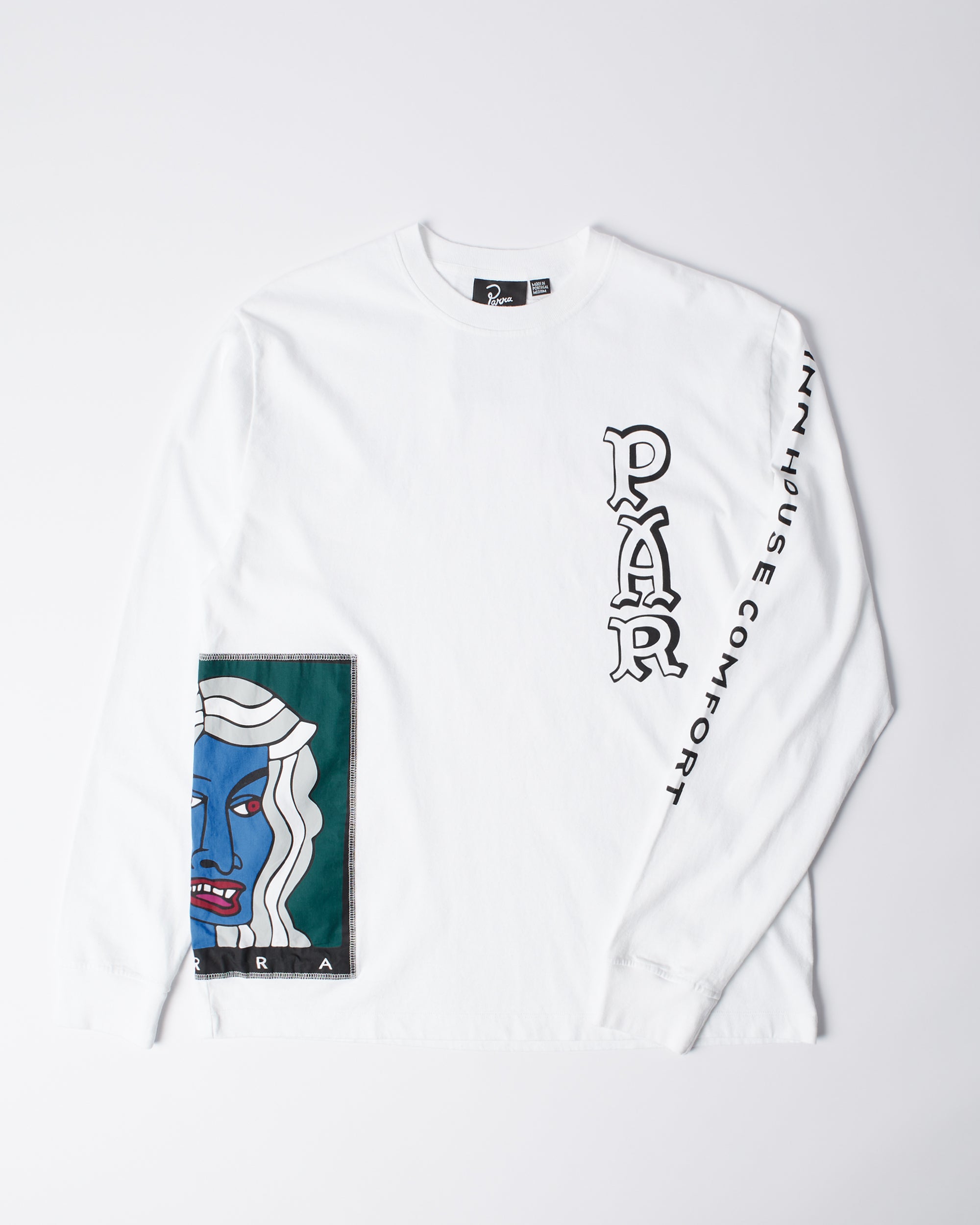 Long sleeve with a big Your face artwork label on the side. Small woven label on the back and water-based screen prints on chest and sleeve. All Parra long sleeves have a boxy custom fit.